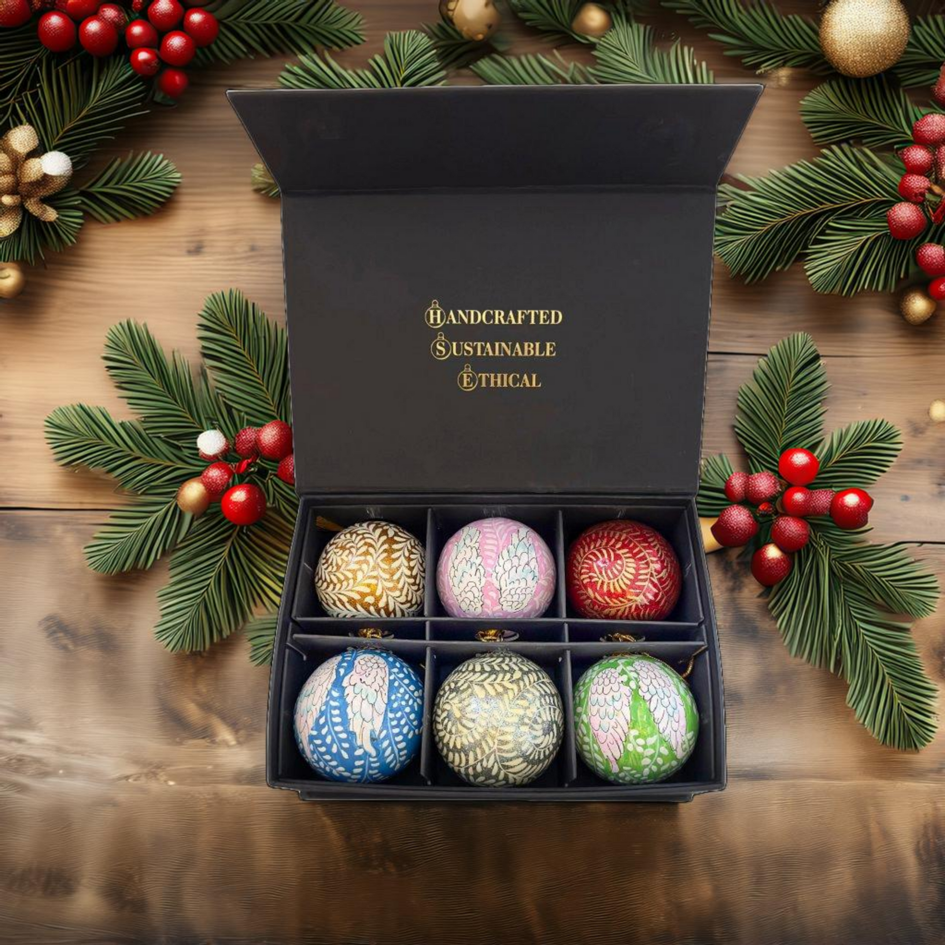 Luxury 6 Box of Handmade Baubles is a Best Christmas Gift for any occasion. The box comes with a magnetic flap which protects these intricately designed baubles. It's made from sustainable materials to protect our planet.
